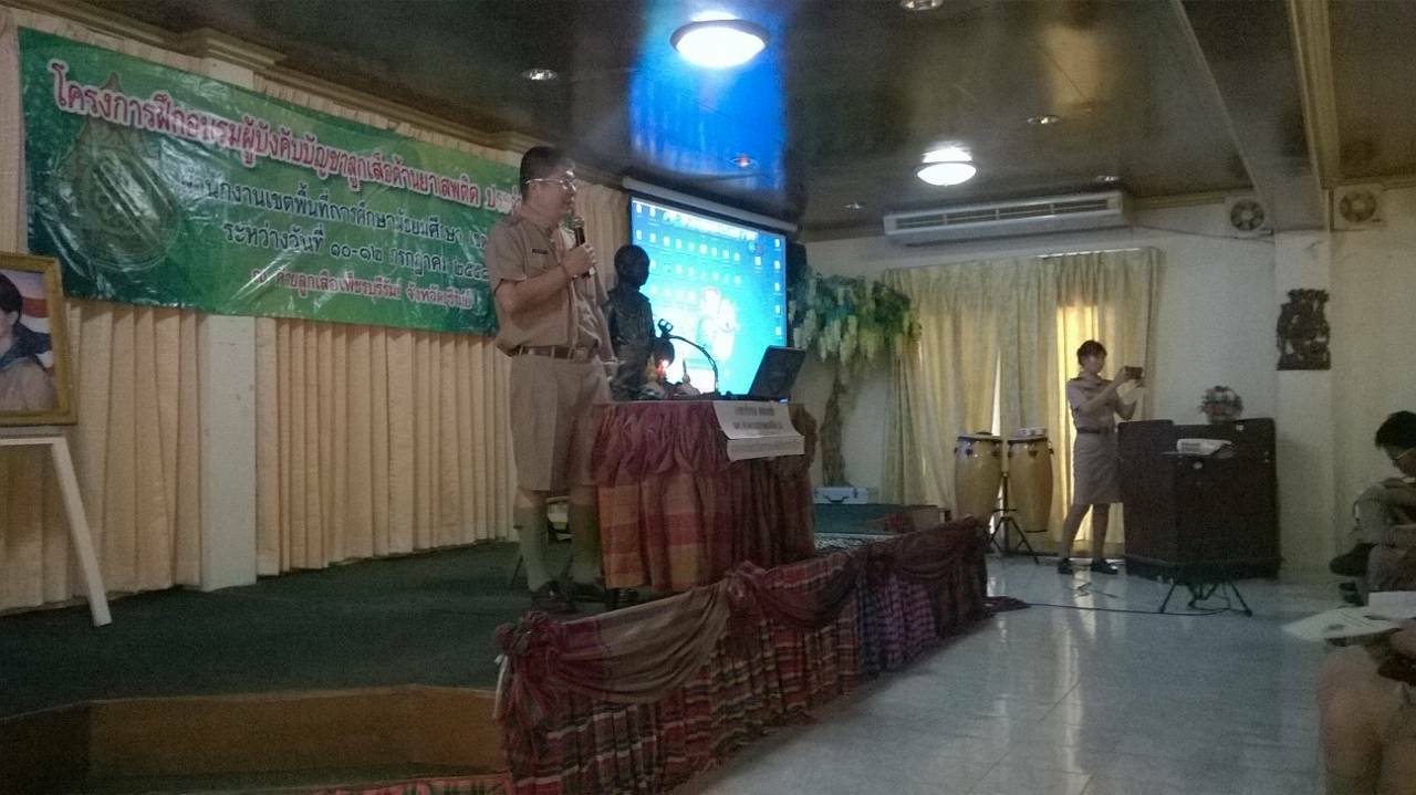 วันที่ 10 กรกฎาคม 2558 เวลา 10.30-15.00 น. นายอำนาจ เหล่ากอที ผอ.วฝ./หัวหน้าเขตพื้นที่ 2 กับ นายชัยวัฒน์ ไชยวงศ์ นักสืบสวนสอบสวนชำนาญการ เข้าร่วมพิธีเปิด และเป็นวิทยากรบรรยายสถานการณ์ นโยบายและแนวทางดำเนินงานป้องกันแก้ไขปัญหายาเสพติดของสถานศึกษา ในโครงการอบรมผู้บังคับบัญชาลูกเสือ เป้าหมายครูสอนลูกเสือจำนวน 60 คน จัดโดย สพม.32 ณ ค่ายลูกเสือเพ็ชรบุรีรัมย์ อ.เมือง บุรีรัมย์